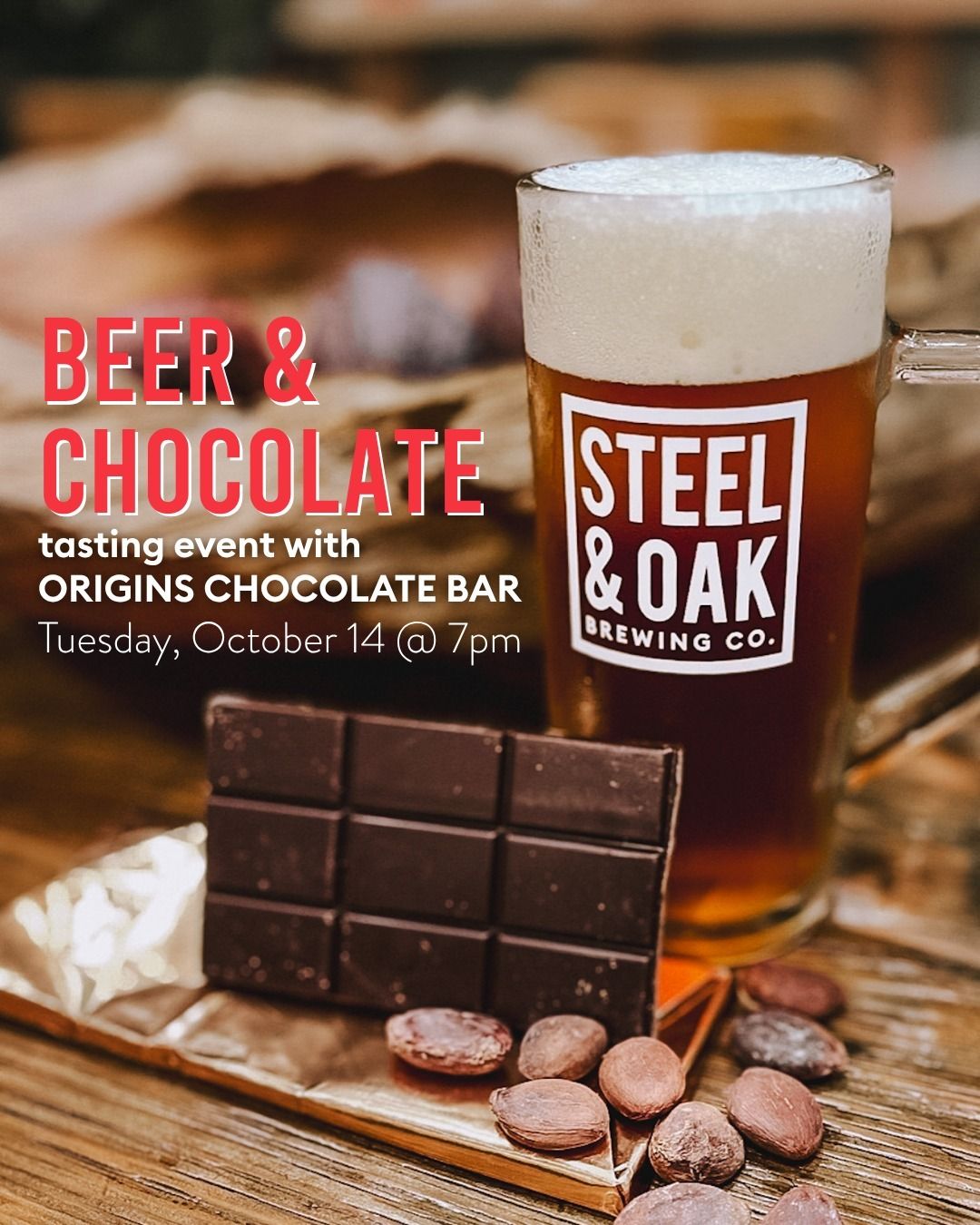 Join Steel & Oak Brewing Co. and Origins Chocolate Bar on Tuesday, October 14, at 7:00 p.m. for an unforgettable night of flavour, fun, and discovery. As part of CHOCTOBERFEST, this exclusive Beer & Chocolate Tasting pairs four finely crafted beers with four artisanal chocolate bars β each combo expertly chosen to surprise your senses and make your taste buds dance.