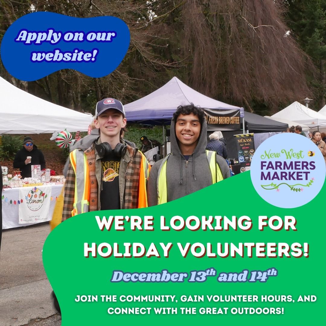 The New West Farmers Market Holiday Market is back for two festive days on December 13 and 14, and organizers are looking for amazing volunteers to help make the magic happen!