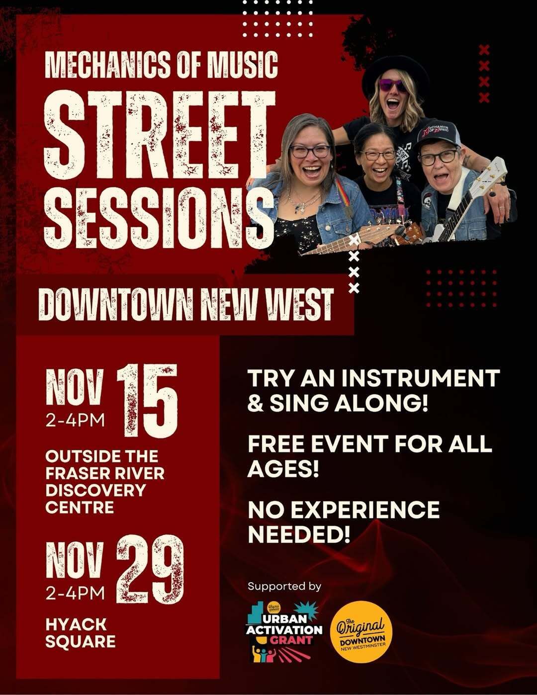 Get ready to make some noise, New West! The Mechanics of Music Street Sessions are bringing live music, hands-on jams, and community fun to Downtown New Westminster this November — and everyone’s invited!