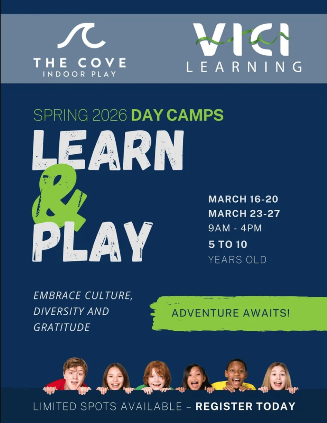 Camps run 9:00 AM to 4:00 PM during Week 1 (March 16โ20) and Week 2 (March 23โ27), welcoming children ages 5 to 10. Through play-based activities inspired by Vini Vici Learningโs values, campers will explore themes of culture, diversity, gratitude, and adventure, while building friendships and confidence along the way.